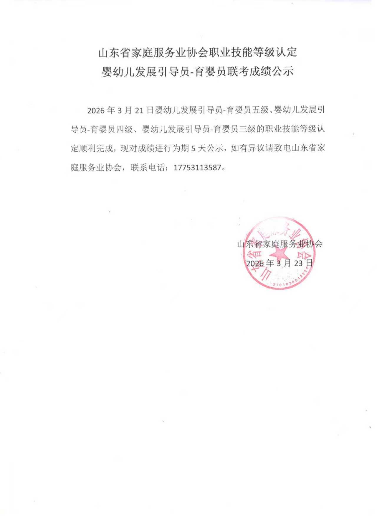 山东省家庭服务业协会2026年3.13-16日职业技能等级认定考试成绩公示