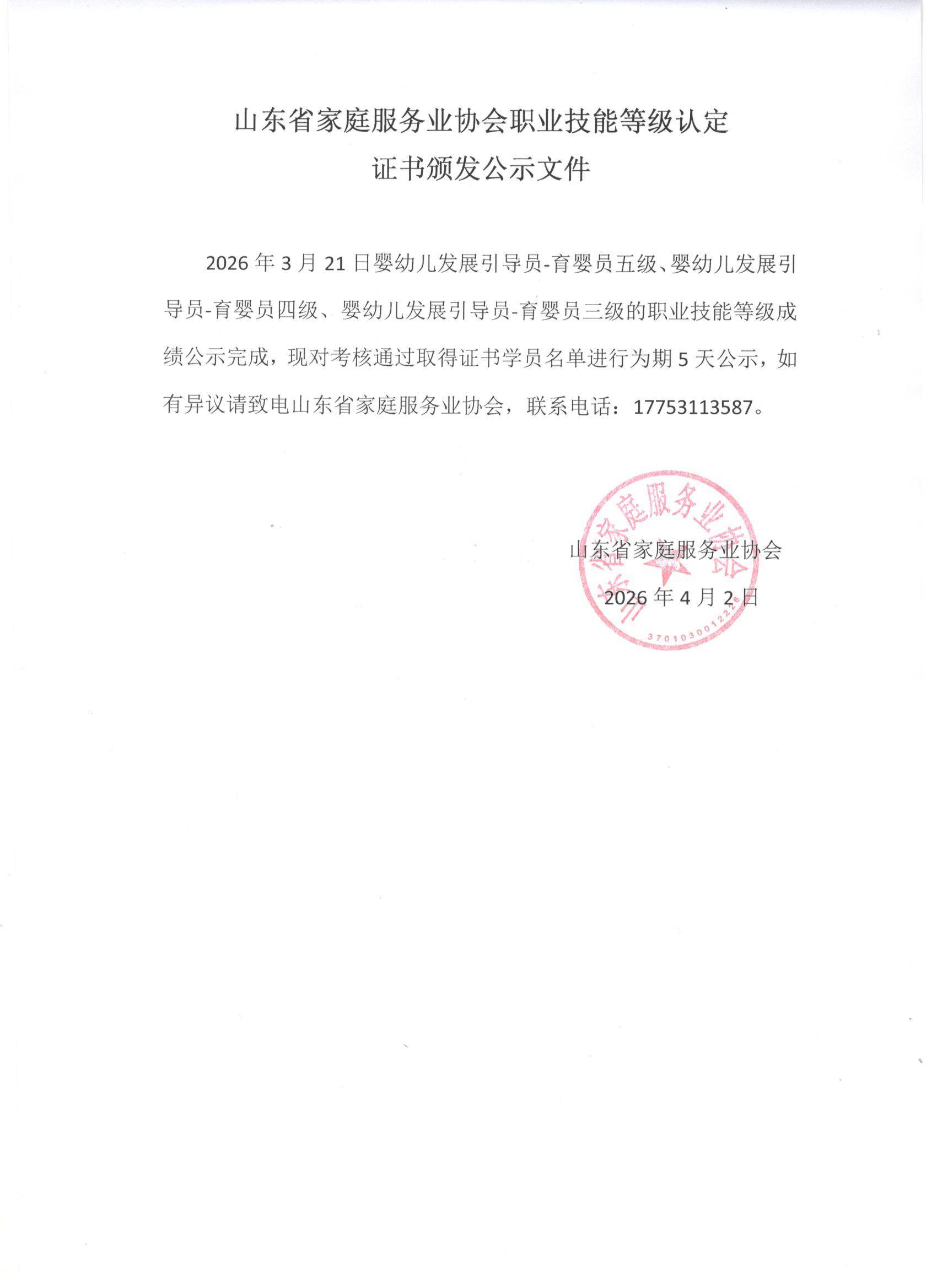 山东省家庭服务业协会职业技能等级认定2026.4.11-15考期证书颁发公示